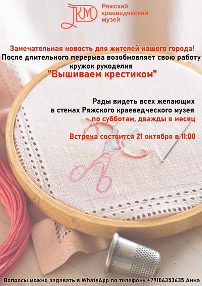 21 октября в 11 часов в Ряжском краеведческом музее состоится первое занятие кружка рукоделия «Вышиваем крестиком».