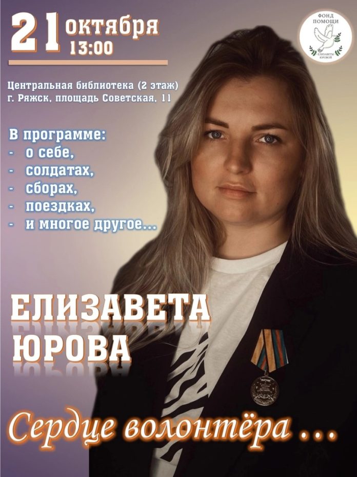 Главная Ряжцев приглашают на встречу с волонтером Елизаветой Юровой От admin - 19 октября, 2023 0 209 21 октября в 13 часов в Ряжской центральной библиотеке состоится встреча с волонтером Елизаветой Юровой. Она расскажет о себе, своей деятельности, ответит на вопросы. Возрастное ограничение 12+. Фото со страницы Ряжской центральной библиотеки