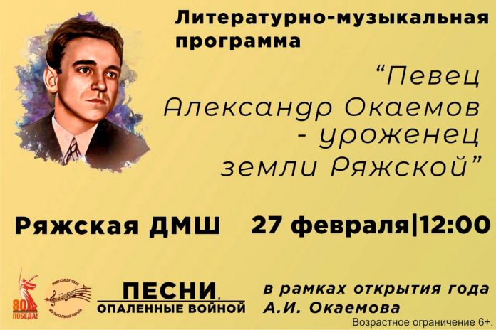 27 февраля в Ряжской детской музыкальной школе состоится литературно-музыкальная программа «Певец Александр Окаемов – уроженец земли Ряжской».