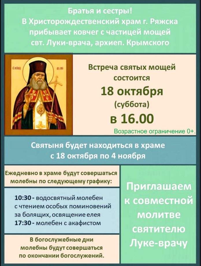 18 октября в 16 часов в Христорождественском храме города Ряжска состоится встреча святых мощей святителя Луки-врача, архиепископа Крымского.