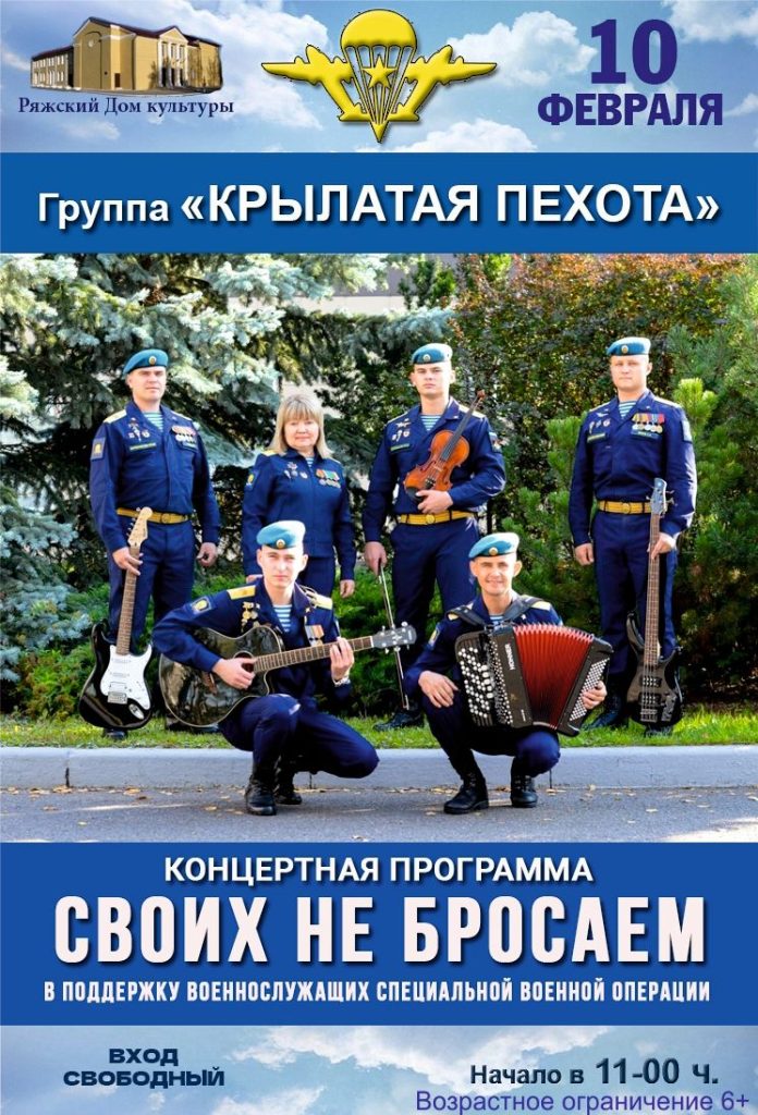 10 февраля в 11 часов в Ряжском Доме культуры состоится концерт «Своих не бросаем» в поддержку военнослужащих специальной военной операции.