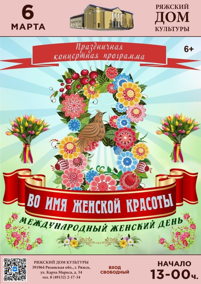 6 марта в 13 часов в Ряжском Доме культуры состоится концерт, посвященный Международному женскому дню 8 Марта.
