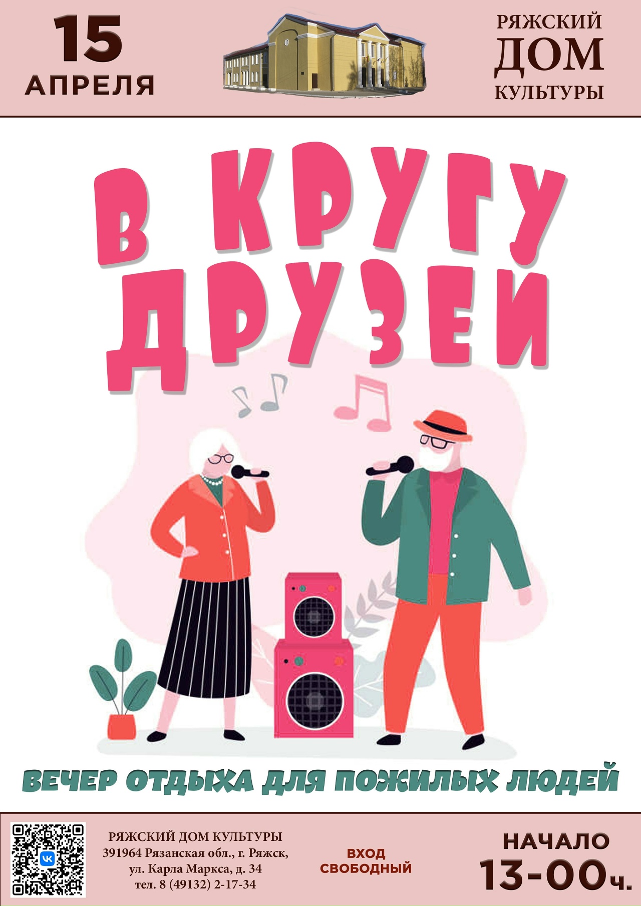 15 апреля в Ряжском Доме культуры состоится вечер отдыха для пожилых людей «В кругу друзей» по программе «Активное долголетие».